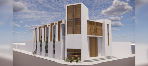 Render del exterior del proyecto de Reconstrucción de la parroquia San Pedro de Puerto Huarmey.